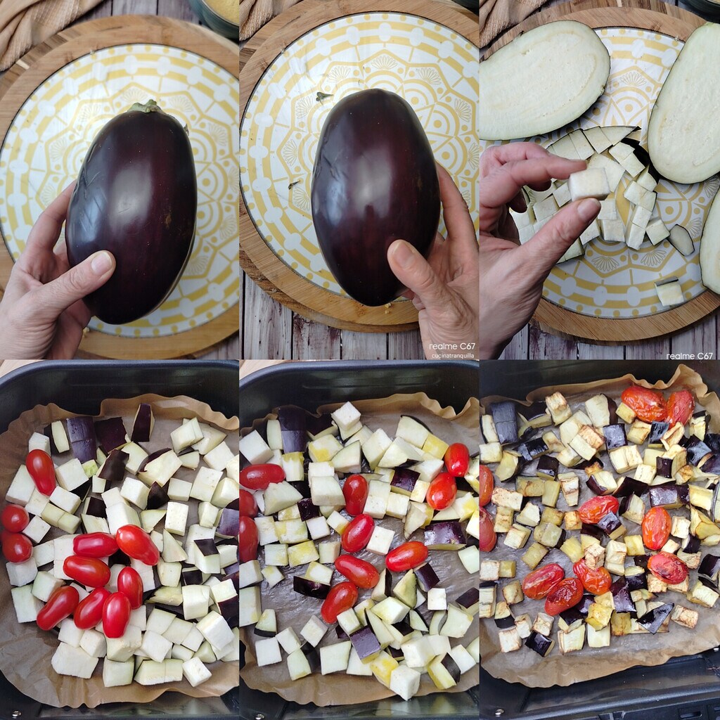 You can cook the eggplants in a pan with oil and salt along with the cherry tomatoes and a couple of tablespoons of water for about 15 minutes, on low heat, stirring often.