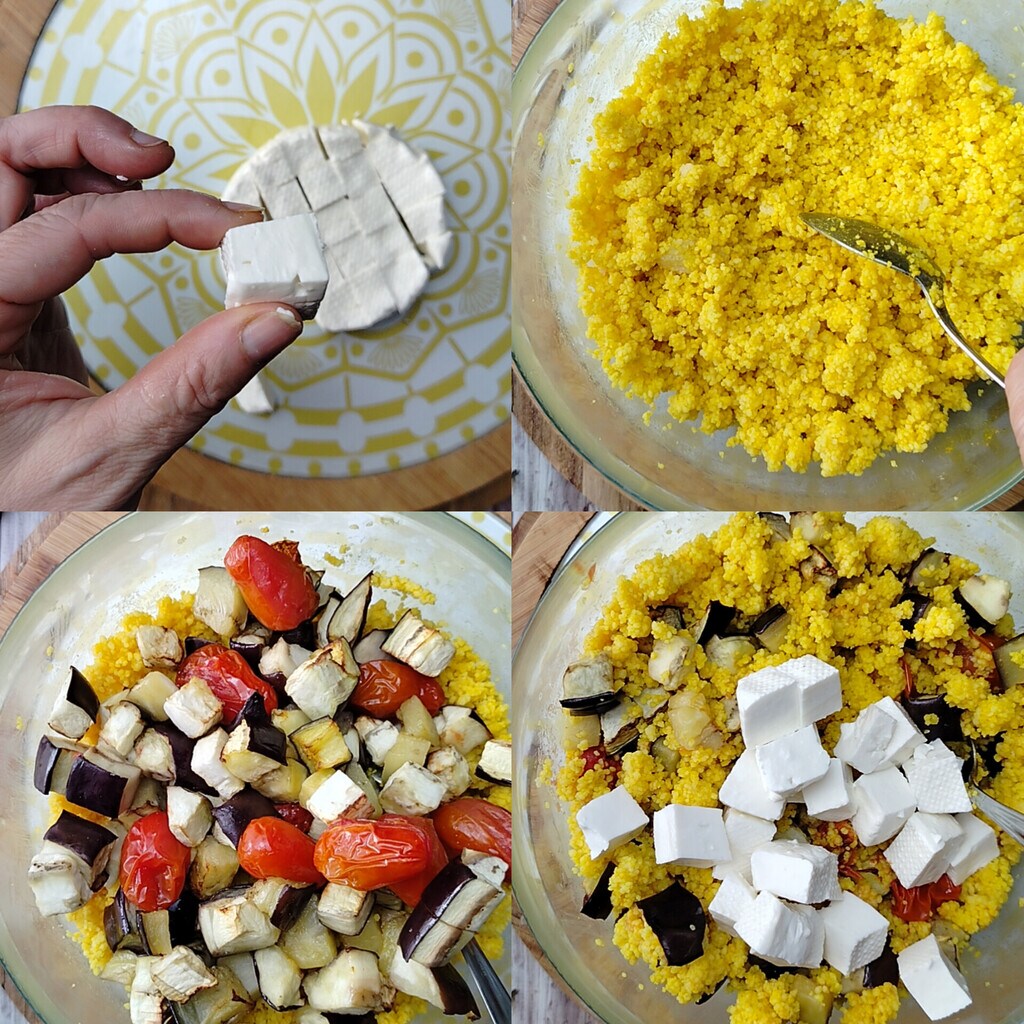 To make the Turmeric Couscous with Eggplants and Cherry Tomatoes, first focus on preparing the couscous.