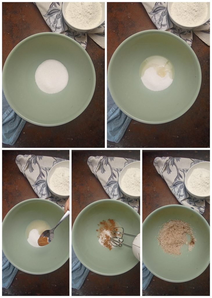 To make the Vegan Plumcake with Apple Juice, first combine the sugar, cinnamon, and sunflower seed oil in the bowl and quickly mix them with the electric whisk.