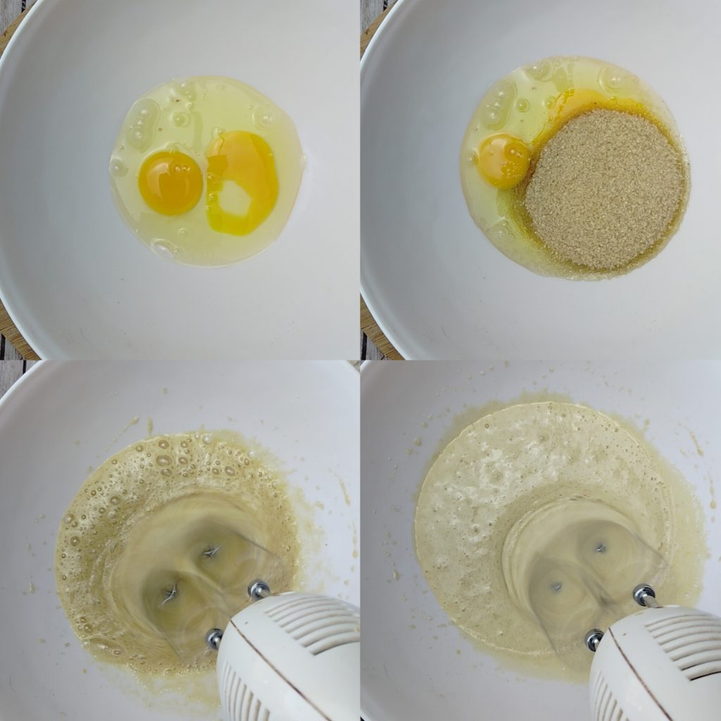 To make the very soft pear and chocolate cake, first work the eggs with the raw cane sugar for at least a couple of minutes, until the mixture becomes fluffier and foamy.