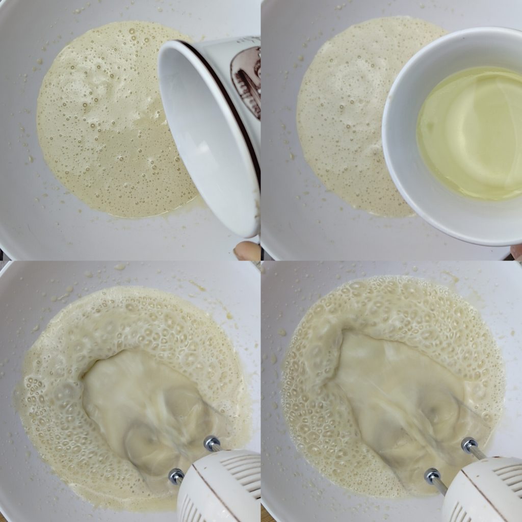 Then add the rice milk and sunflower oil and continue mixing for another couple of minutes, still using the electric mixer. This operation will help to blend all the liquid ingredients well together.