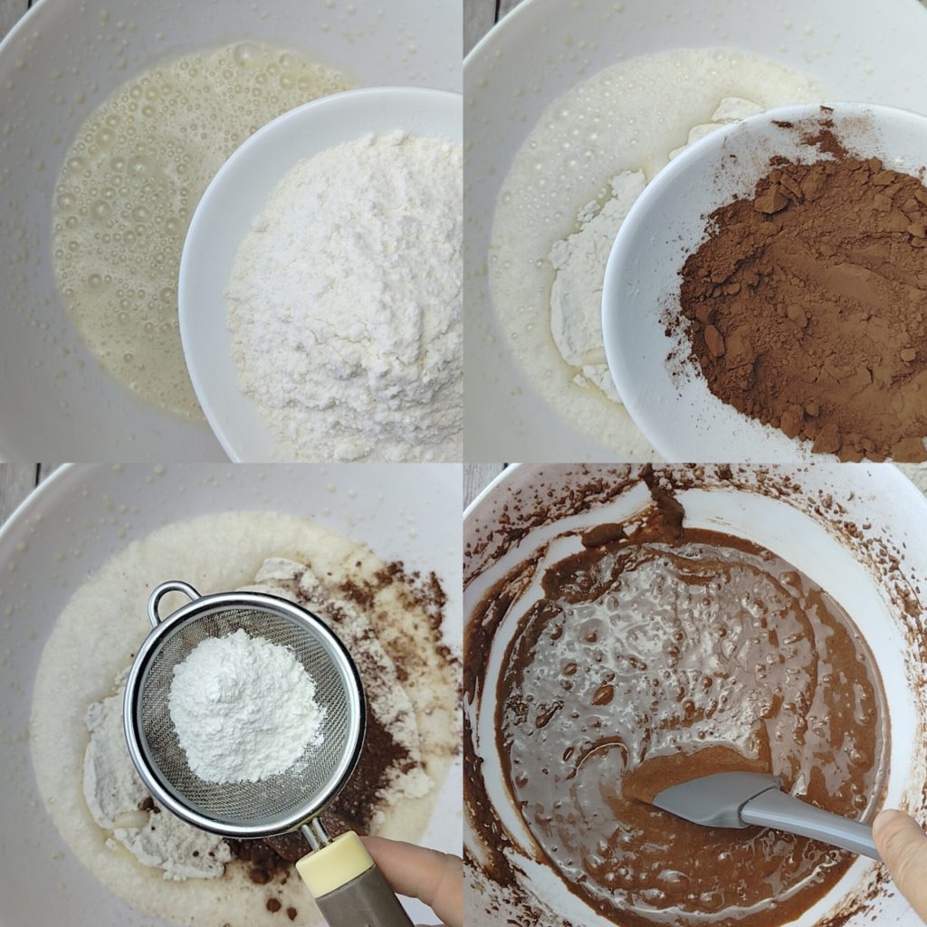 After this step, add the dry ingredients one at a time. Add the flour, unsweetened cocoa and sifted baking powder using a sieve and continue to mix first with the electric mixer and then, with the help of a spatula, thoroughly gather the contents from the edges of the bowl, ensuring that no unmixed powder remains at the bottom.