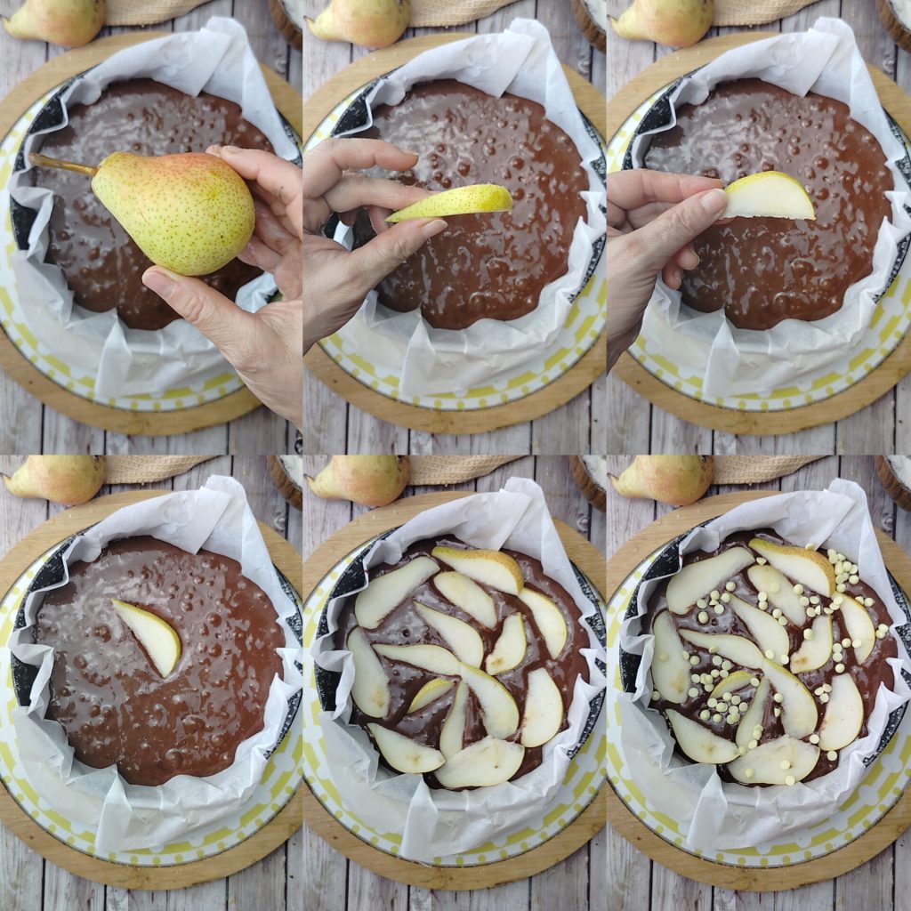 Line a 20 cm cake mold with parchment paper and spread the chocolate mixture, leveling it. On the surface, arrange the pear slices as you prefer. I used organic pears, with the whole skin washed and dried well, after cutting them at the moment, in a thickness of about 1/4 inch on the widest part as in the photo. Garnish with white chocolate chips.