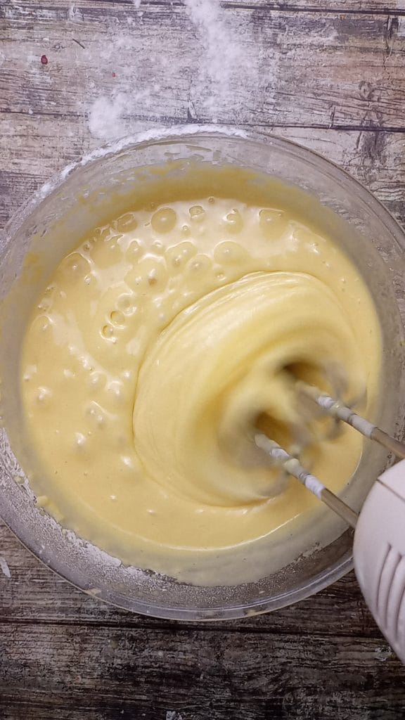 You can beat them with a hand whisk or an electric one. Pour in the melted and cooled butter.