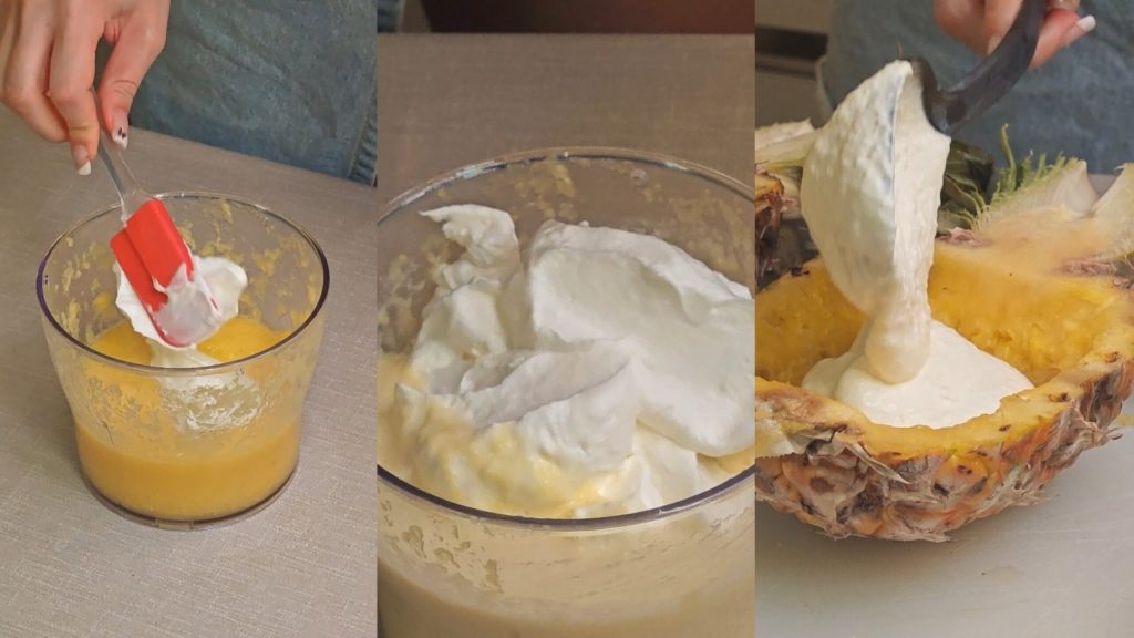 • Combine the ingredients: Mix the pineapple puree with the yogurt, then gently fold in the whipped cream.
