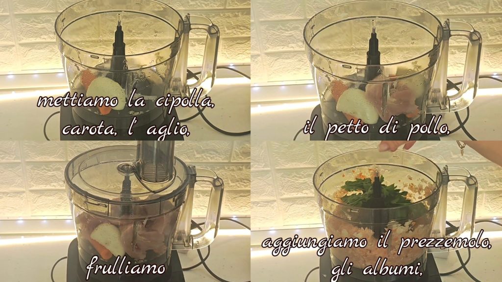 Put the onion, carrot, garlic, chicken breast, and blend. Add parsley, egg whites,