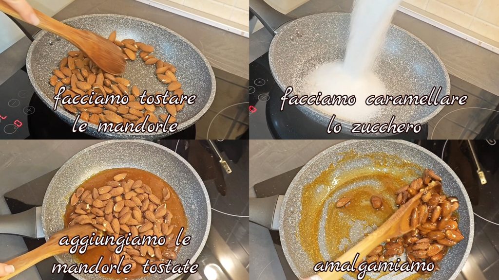 First, toast the almonds (I chose to do it in a pan, but if it’s more convenient for you, you can also do it in the oven). Caramelize the sugar then add the previously toasted almonds and mix together.