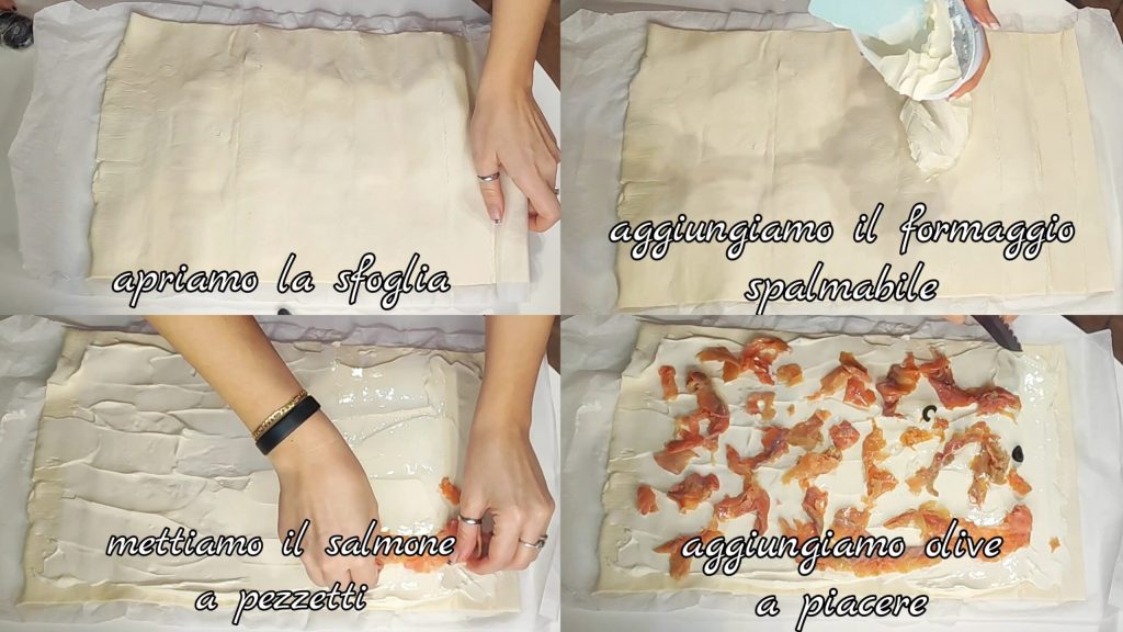 First, we need to open the sheet of puff pastry. Spread the cream cheese over it and use a spatula to cover the entire surface of the pastry. Add the salmon pieces and the pitted and chopped olives (or buy the canned sliced ones directly).