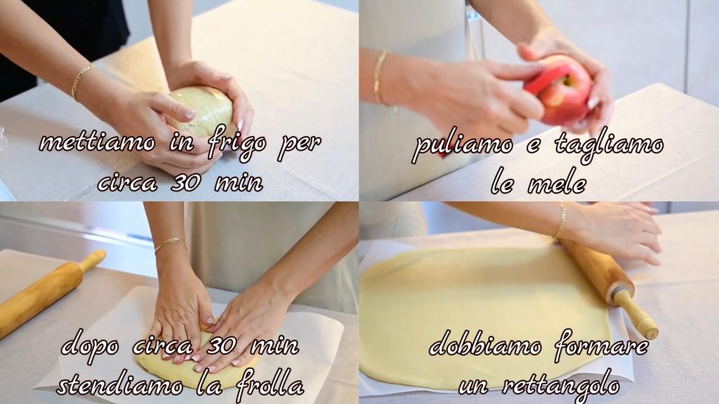 Clean and dice the apples. After about 30 minutes, roll out the pastry on baking paper. Form a rectangle.
