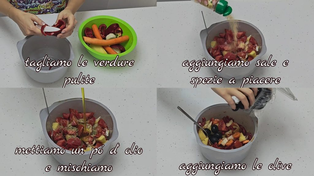 • First, clean, wash, and cut the vegetables as you like (pieces, slices, rounds, etc.). Add some salt and spices to taste (pepper, rosemary, garlic, etc.), a bit of oil and mix. Add the olives and combine.