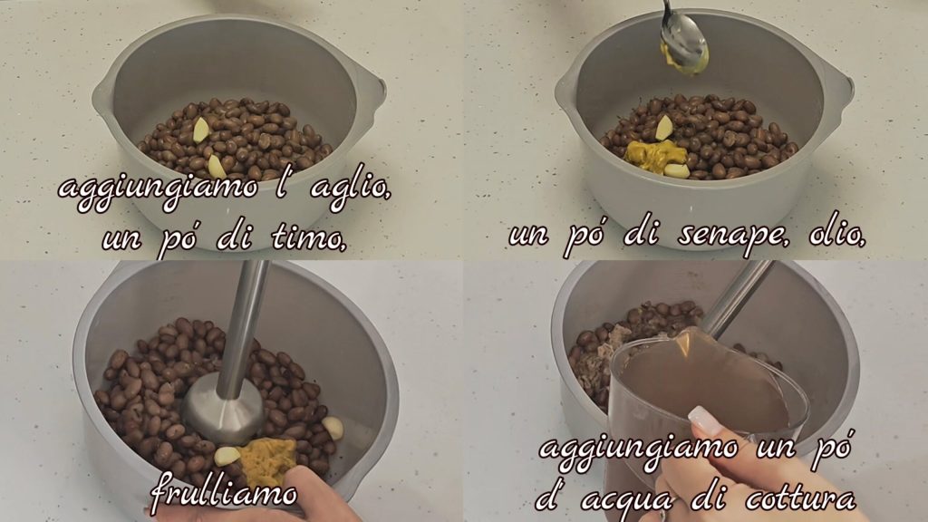 Add the garlic, a bit of thyme, mustard, oil, and blend with an immersion blender. Add some cooking water and blend until you get a cream.