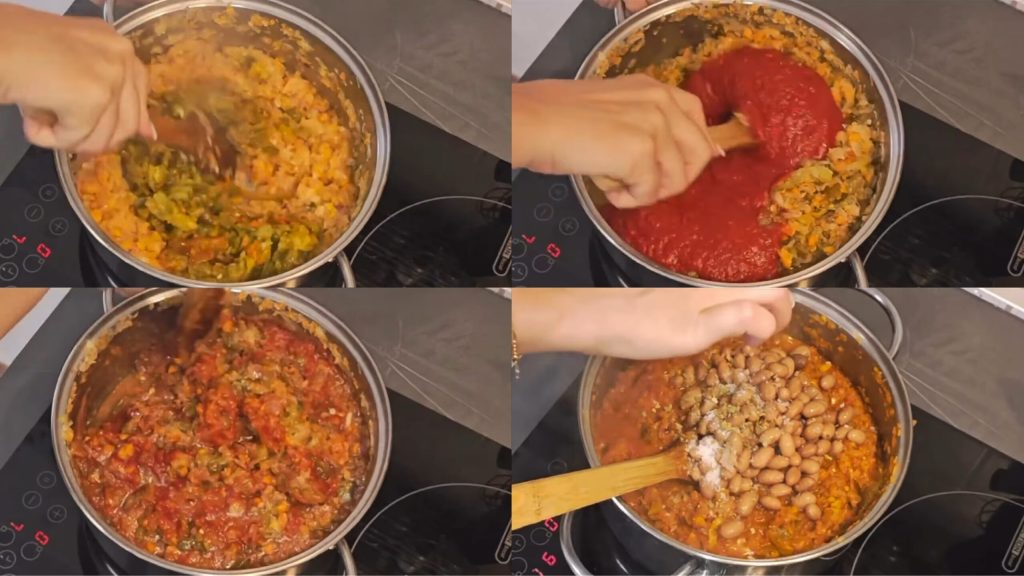 At this point, add the roasted peppers, mix well and let the mixture absorb the flavors for a few minutes. Then pour in the tomato puree, partially cover, and let it cook on low heat for about 30 minutes, stirring occasionally. When the vegetables are well cooked, add the cooked beans, a pinch of salt, a few peppercorns, and a bay leaf.