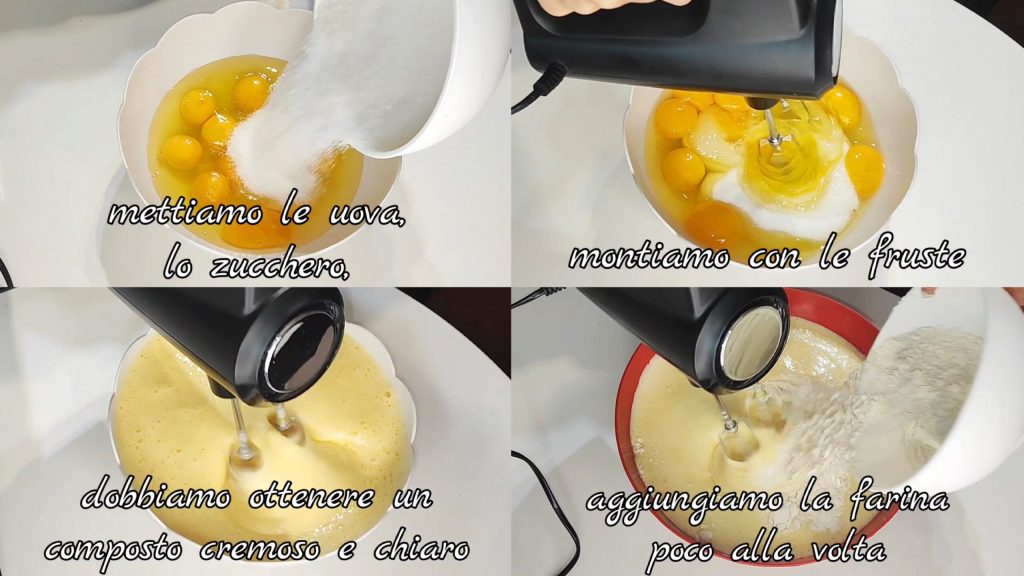 In a bowl, put the eggs and sugar, and whisk until the mixture is light and creamy! Add the flour little by little while mixing.