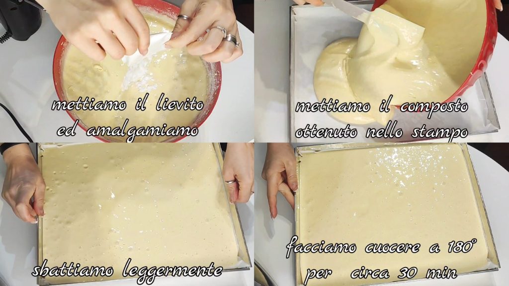 Finally, add the baking powder and mix. Pour the batter into a 16×12.5 inch pan lined with parchment paper, level it, and bake at 356°F for about 30 minutes.