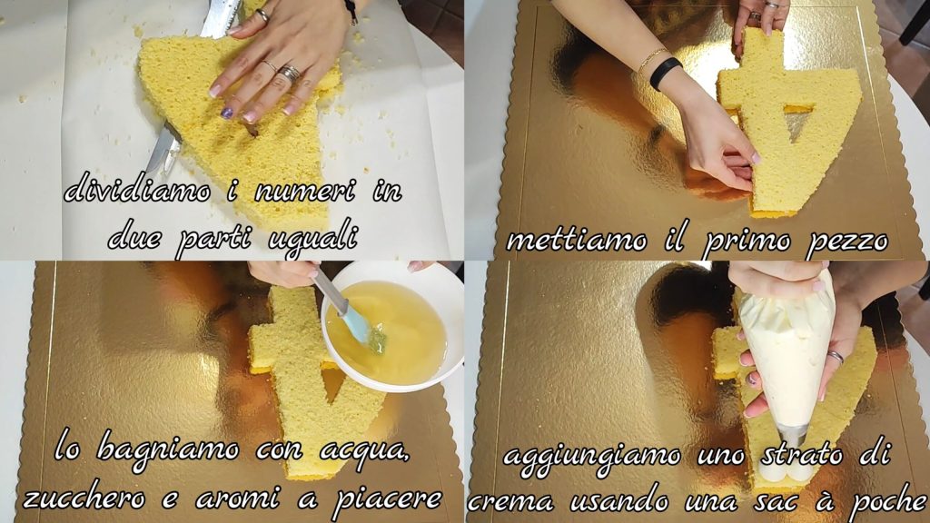 Cut the numbers into two equal parts. Place the first piece and soak it with water, sugar, and flavors to taste. Add a layer of cream using a piping bag.