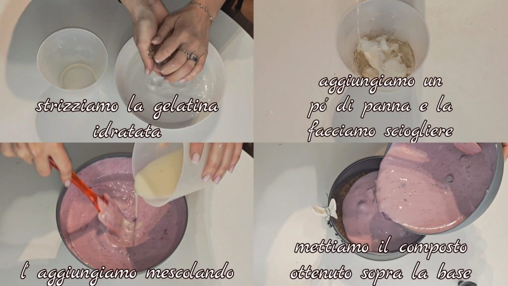 Squeeze the previously soaked gelatin, add a bit of cream, and dissolve it over the heat or in the microwave. Add it to the mixture, stirring. Place the obtained mixture over the cookie base