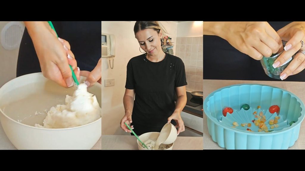 • In a bowl, mix ricotta with sugar, add chocolate chips and mix well. Add the cream and mix. Take a mold (preferably silicone otherwise you will need to cover it with plastic wrap to facilitate removal after freezing) and place candied fruits at the bottom as desired