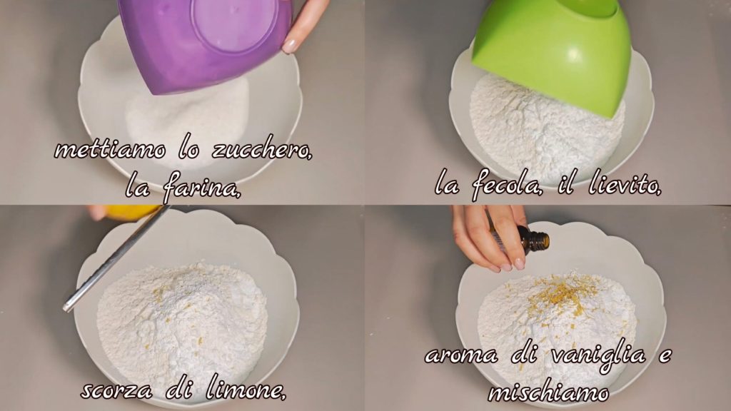 • In a bowl, put the sugar, flour, starch, baking powder, lemon zest, vanilla flavoring and mix.