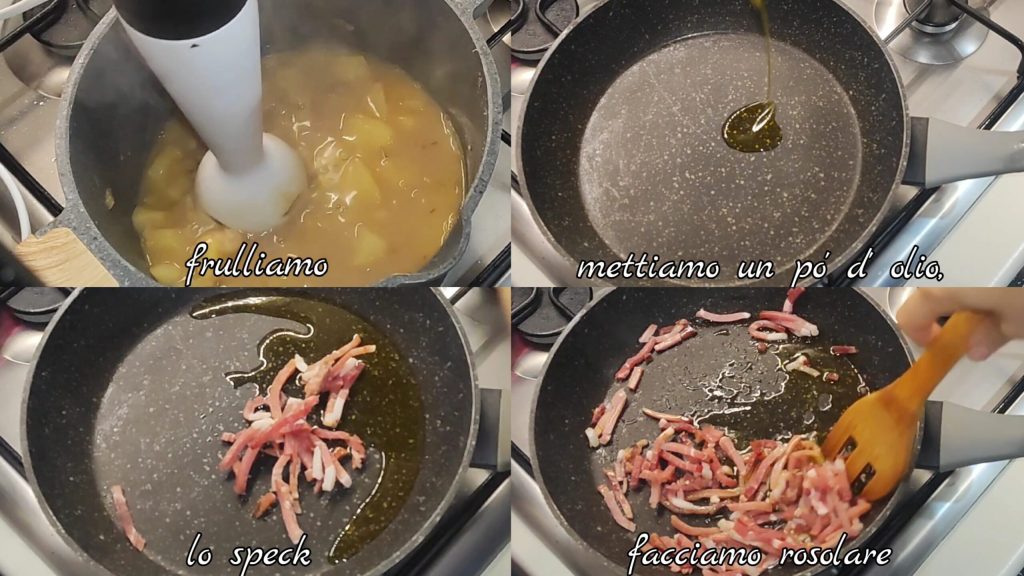 At the end of cooking, blend everything with an immersion blender. Meanwhile, in a pan, add some oil, the speck (matchsticks), and fry.