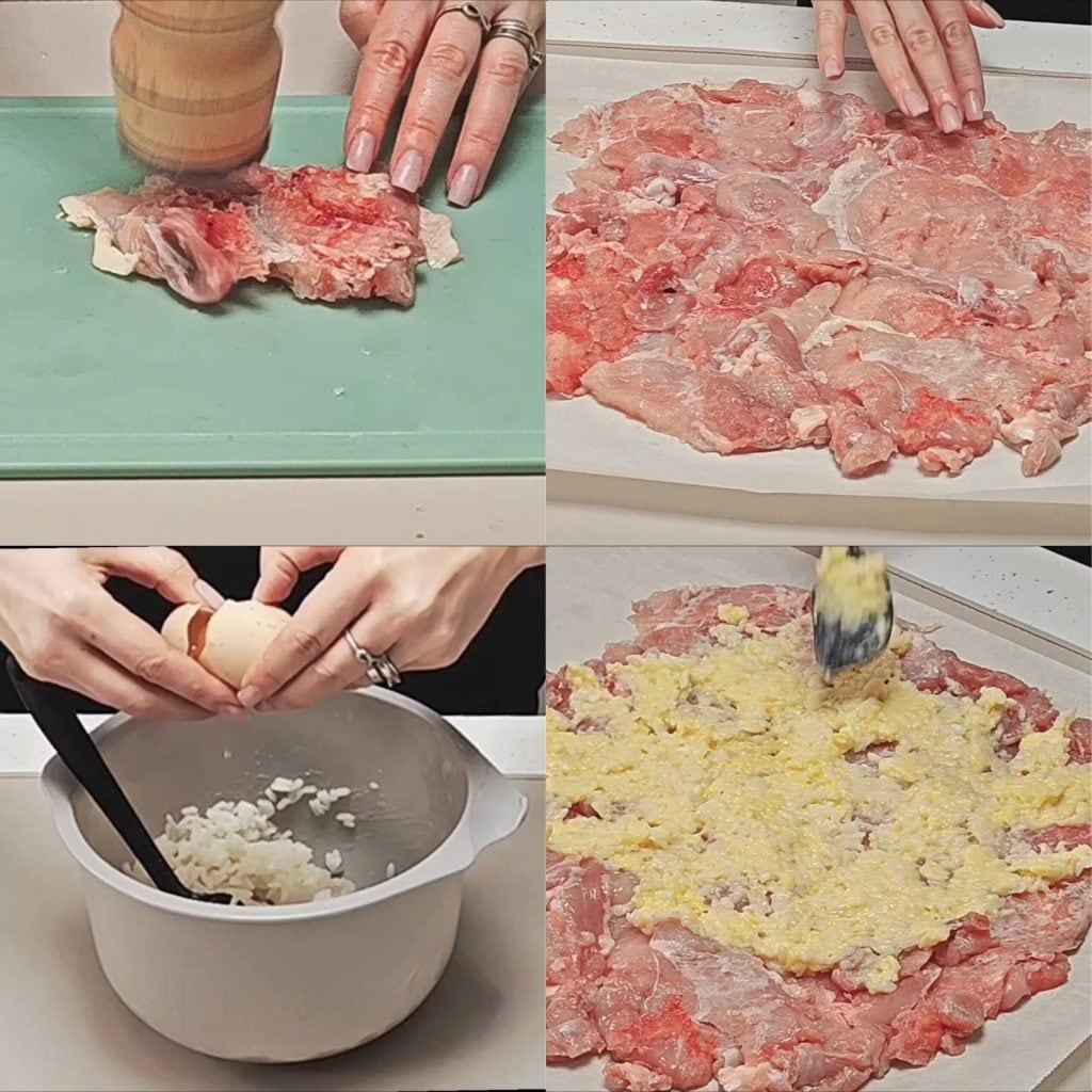 Pound the chicken thighs and line them up on parchment paper. Add the cooked rice, egg, Parmesan cheese, a pinch of salt, and mix. Spread the mixture over the meat.