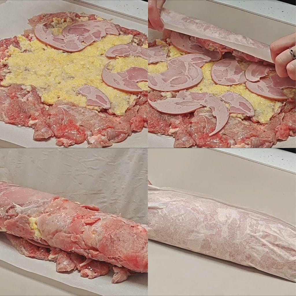 Add a bit of salt, some oil, garlic, the cooked ham, and roll up. Close tightly and bake at 350°F for about 50 min.