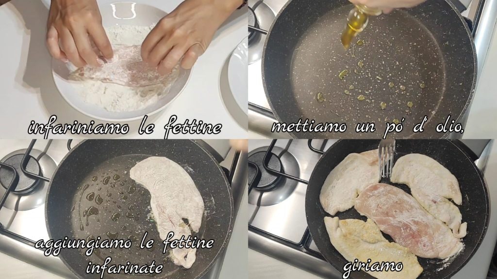 First, flour the chicken slices. In a pan, add some oil and heat it. Add the floured slices and brown for a few minutes, then turn them.