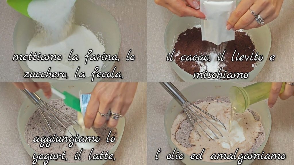 In a bowl, mix the flour, sugar, potato starch, cocoa, and baking powder. Add the yogurt, milk, oil, and mix.