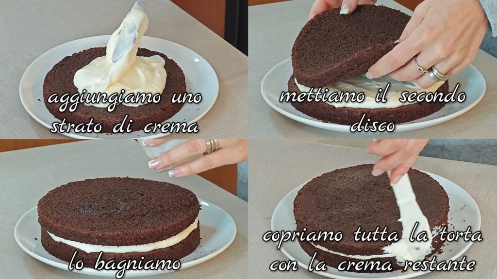 add a layer of cream. Place the second disc, moisten it, and cover the entire cake with the remaining cream.
