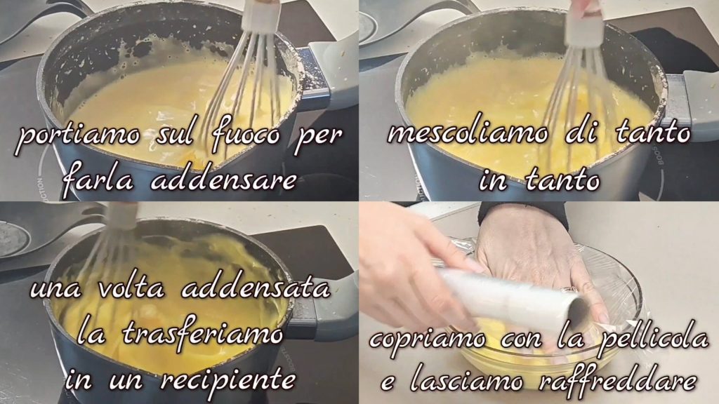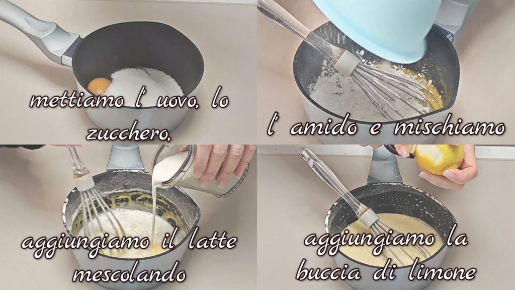 In a saucepan, put the egg, sugar, cornstarch, and mix. Add the milk gradually and the lemon peel.