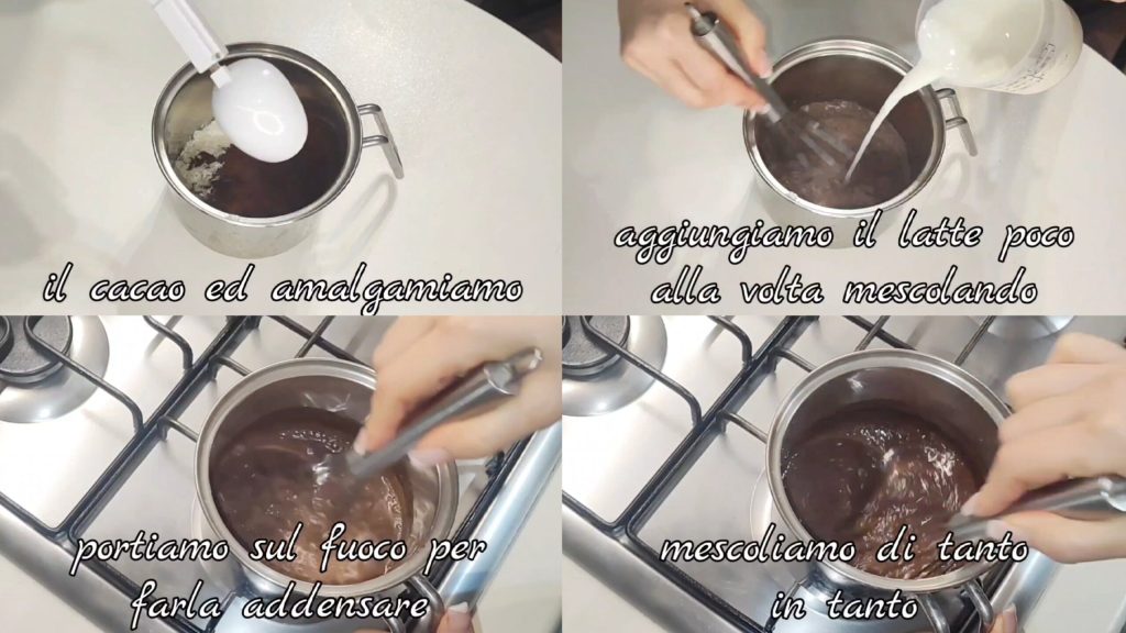Add cocoa and blend. Gradually add the milk mixing to prevent lumps. Bring to heat to thicken, stirring to prevent sticking.