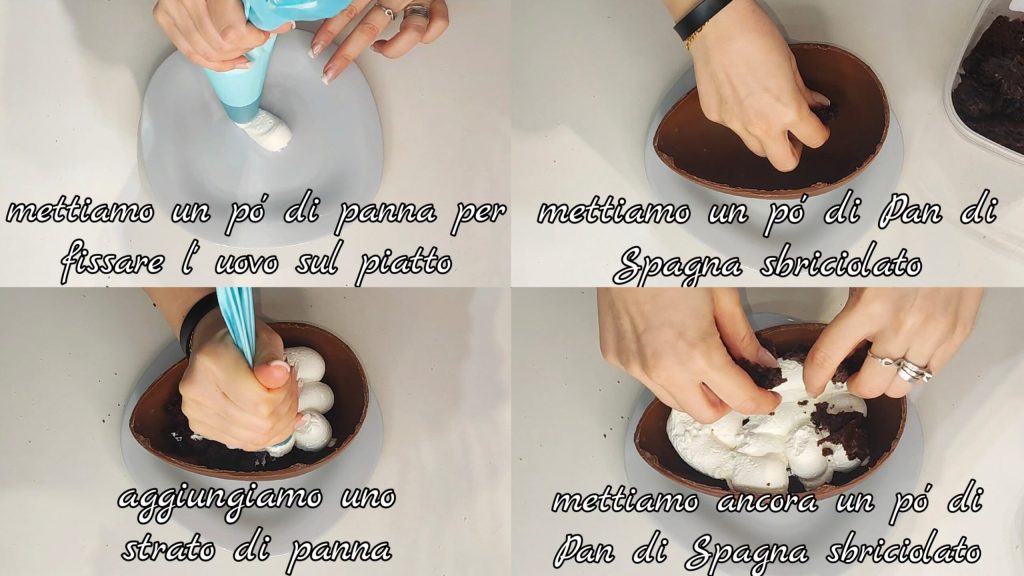 The preparation of the Chocolate Egg Filled with Cream and Sponge Cake is very simple and quick, watch the video HERE.