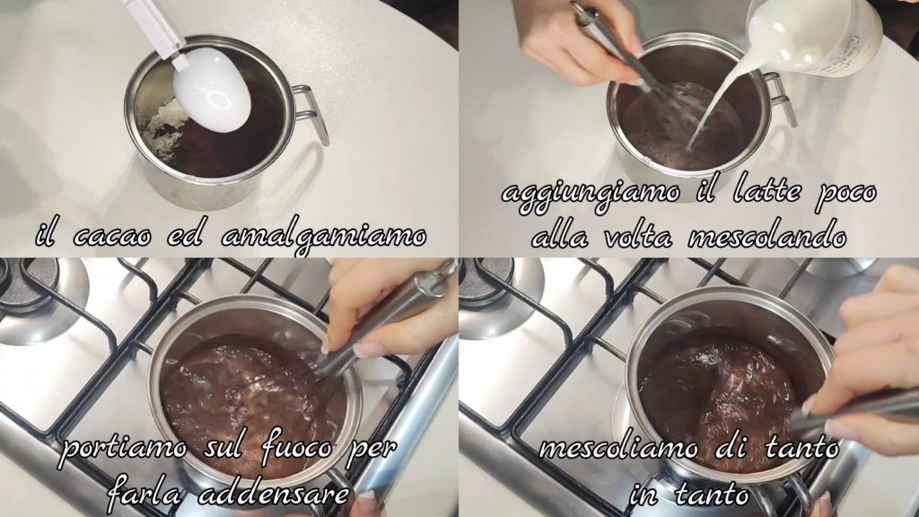 • Add the cocoa and mix. Gradually add the milk while stirring with a whisk to prevent lumps. Bring it to the heat to thicken, stirring constantly.