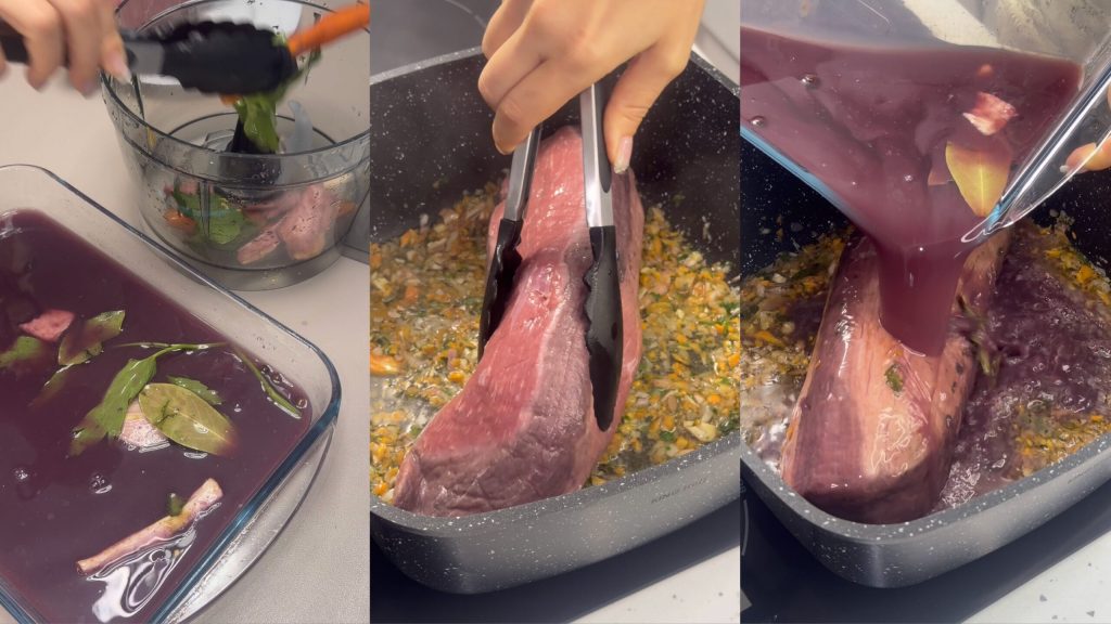 The Christmas braised beef in red wine is an elegant and tasty dish, perfect for Christmas lunch or dinner. The meat is marinated in red wine with vegetables and herbs, seared in a pan, and then cooked slowly until it becomes very tender.