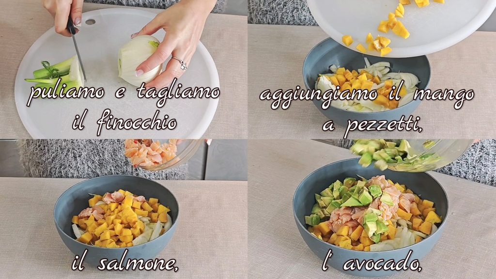 First, clean the fennel and slice it thinly, also clean the mango and add it, the smoked salmon, clean and slice the avocado and add it,