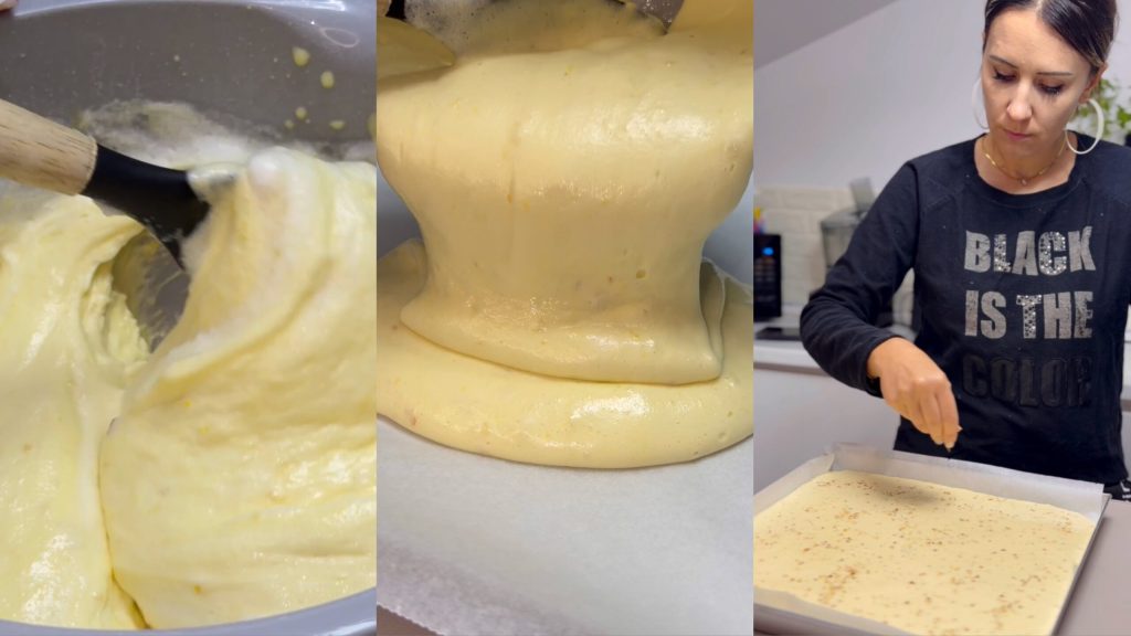 • Line a 14×14 inch rectangular pan with parchment paper. Pour the batter and level it well. Add some almond sprinkles on top!