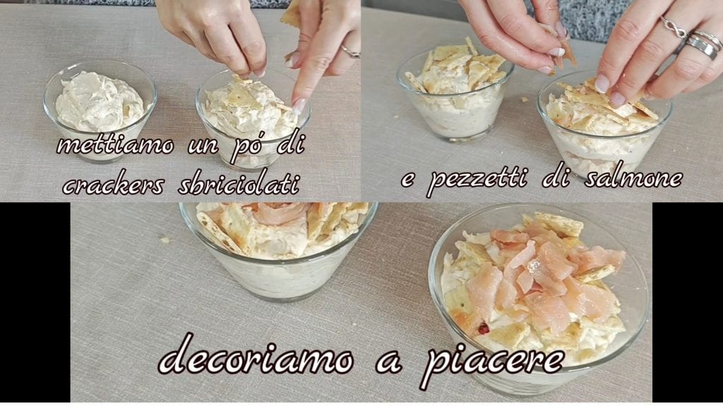 Mix the obtained cream with the tuna. Place some cream in small glasses. Add some crackers, salmon pieces, and some more cream on top.