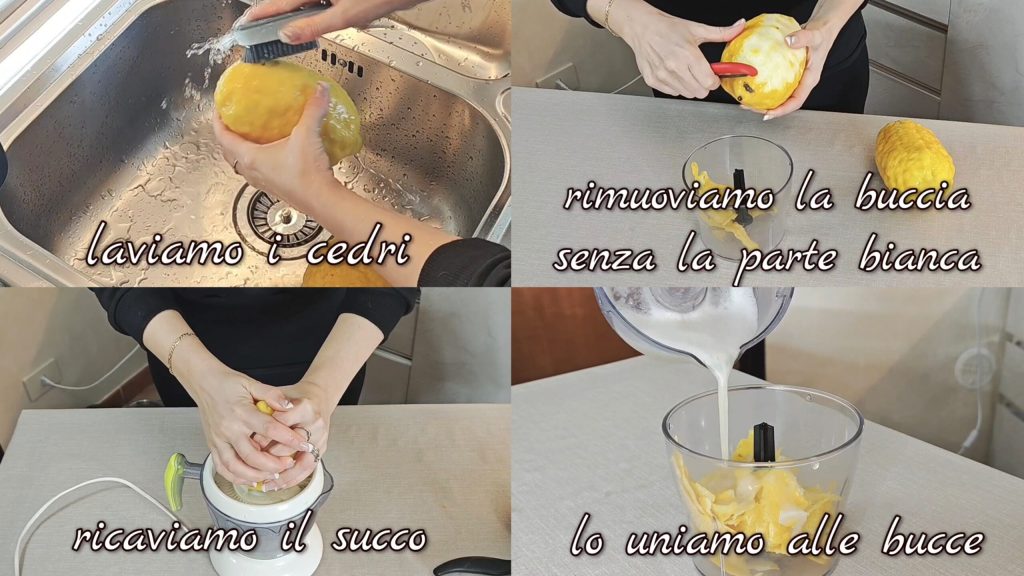 First, wash the citrons thoroughly using a brush or a new sponge using the rough side. Remove the peel as thinly as possible avoiding the white part. Squeeze them to extract the juice to which we will add over the peels.