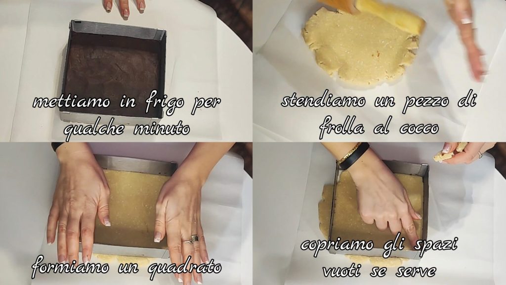 After about 30 min, roll out some cocoa pastry and use a template to cut out a square. Press well