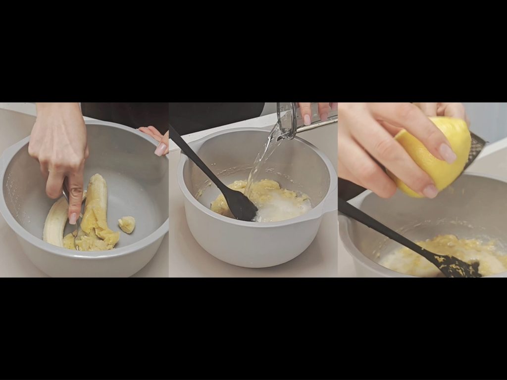 Start by mashing 2 ripe bananas with a fork until you get a puree. Add the sugar, sparkling water, oil, lemon juice, and zest and mix well.