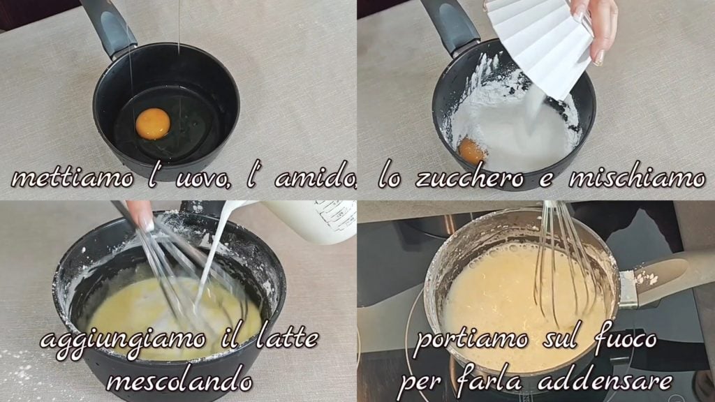 Place the egg, cornstarch, sugar, and mix. Add the milk while stirring to avoid lumps. Bring to heat to thicken.