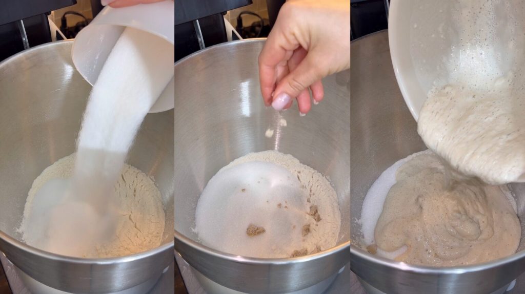When the preferment is ready, put the flour, sugar, yeast and the preferment into the mixer.