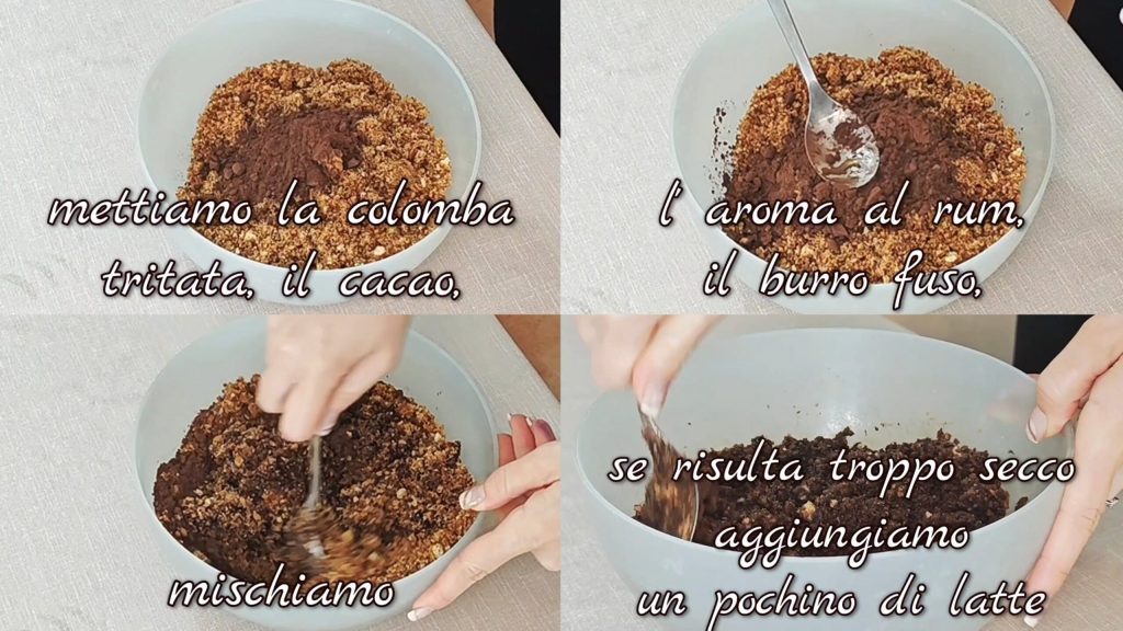 In a bowl, put the chopped colomba, cocoa, rum flavoring, melted butter and mix. If the mixture is too dry, add a little milk.