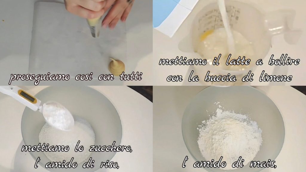 Boil the milk with the lemon peel (I always do it in the microwave). In a microwave-safe container, place the sugar, the rice starch, and the cornstarch.