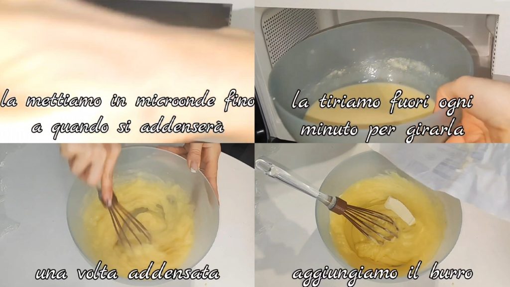 mix. Add the egg, the cream, the milk and blend well. Put the container in the microwave until the cream thickens, taking it out every minute and mixing with a whisk (it will take 4/5 minutes depending on the power of your microwave). Once thickened, remove the peel, add the butter