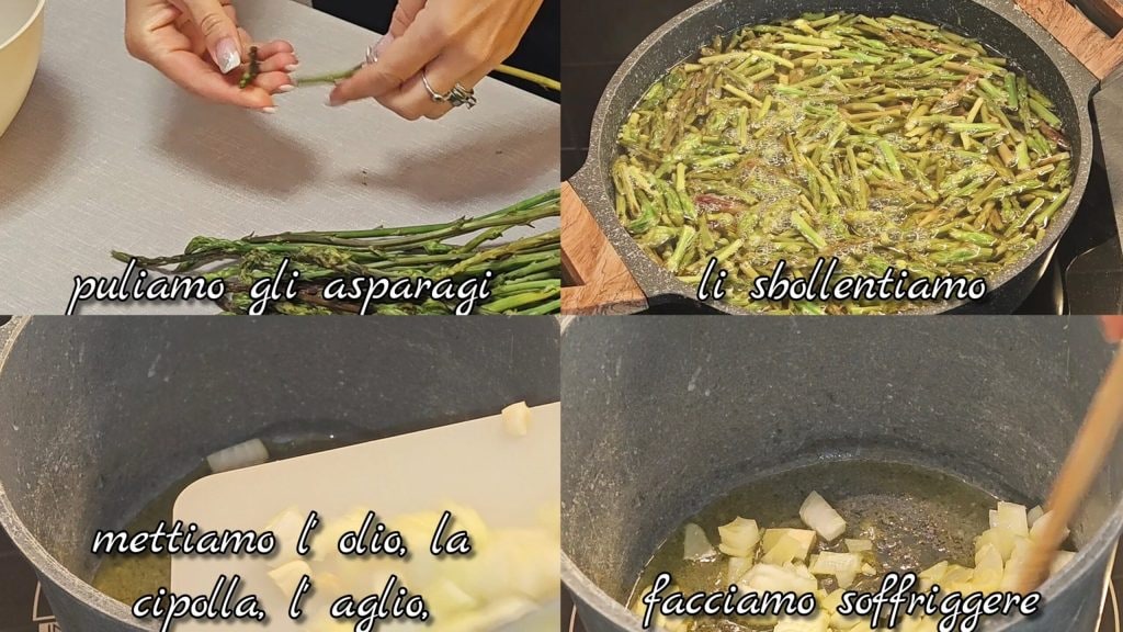 First, we need to clean the asparagus by removing the tough root part, I used wild asparagus but the ones from the supermarket are also fine. We wash them well and blanch them (if you use supermarket ones, you can skip this step). In a pot, put some oil, onion, garlic, and let it sauté.