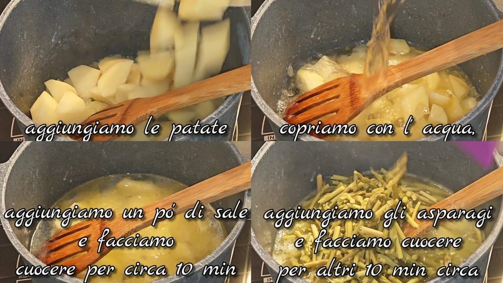 Add the cleaned, washed, and diced potatoes, then cover them with water. Salt and cook for about 10 minutes, then add the asparagus and continue cooking for another 10 minutes.