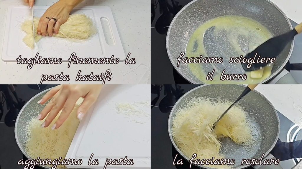 Finely chop the kataifi pastry. Melt the butter. Add the chopped pastry and sauté.