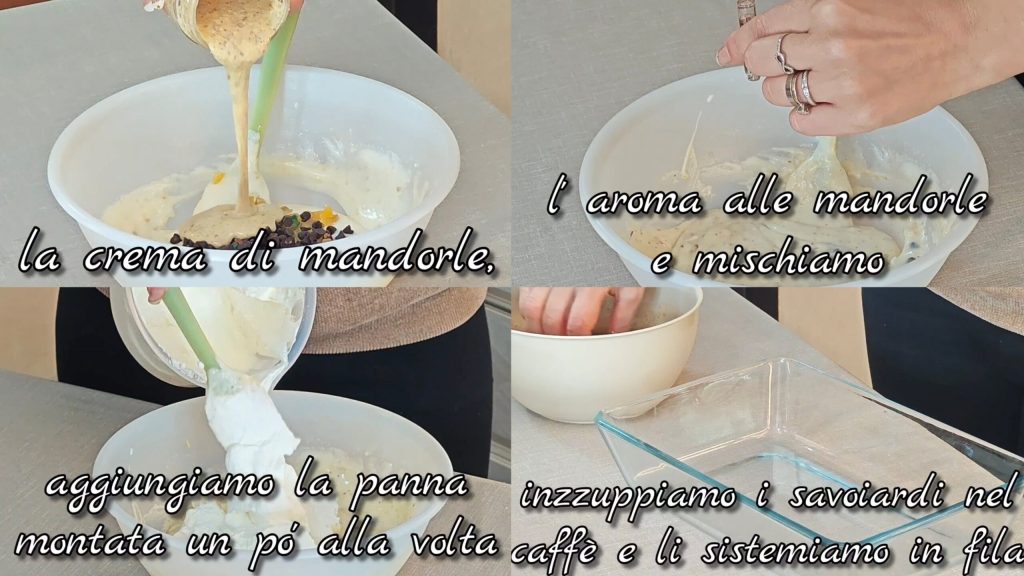 Add the almond cream, almond flavoring, and mix. Gradually fold in the whipped cream. Dip the ladyfingers in coffee or milk and arrange them in a row in the dish.
