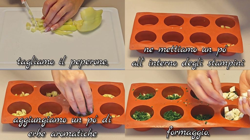 Take the muffin tins and place a few pieces of bell pepper on the bottom of each cup.