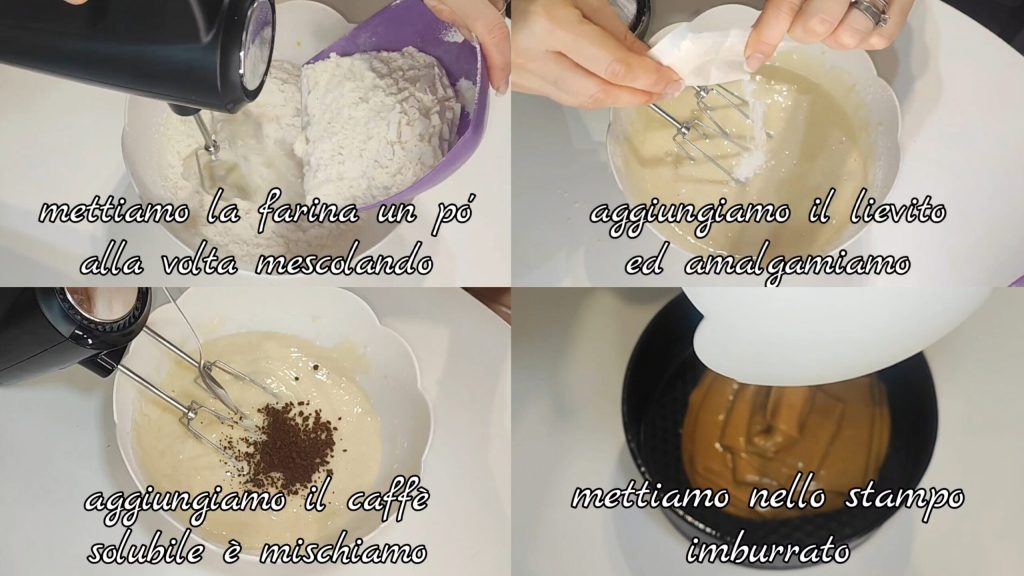Add the flour little by little while stirring. Finally, add the baking powder and instant coffee. Pour the mixture into a greased mold.